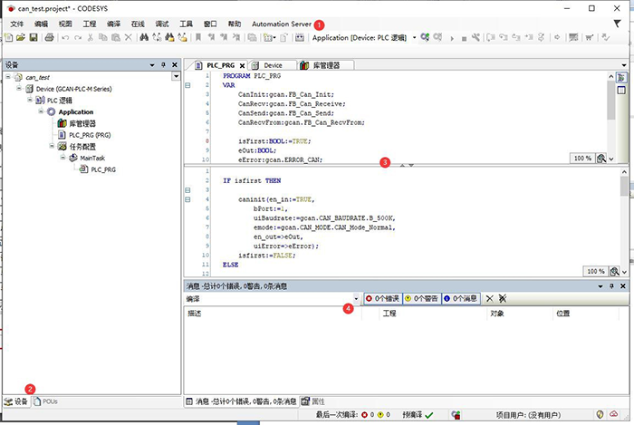 GCAN-PLC-301/302可使用OpenPCS軟件對其編程,也可使用Codesys V3.5 SP16及以上版本軟件對其編程。軟件支持符合IEC-61131-3標(biāo)準(zhǔn)中規(guī)定的五種標(biāo)準(zhǔn)編程語言,這使得程序的可移植性和復(fù)用性很強(qiáng),而且軟件還具有多種調(diào)試功能(斷點(diǎn)、單步等),調(diào)試程序更加方便。