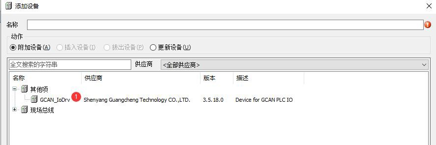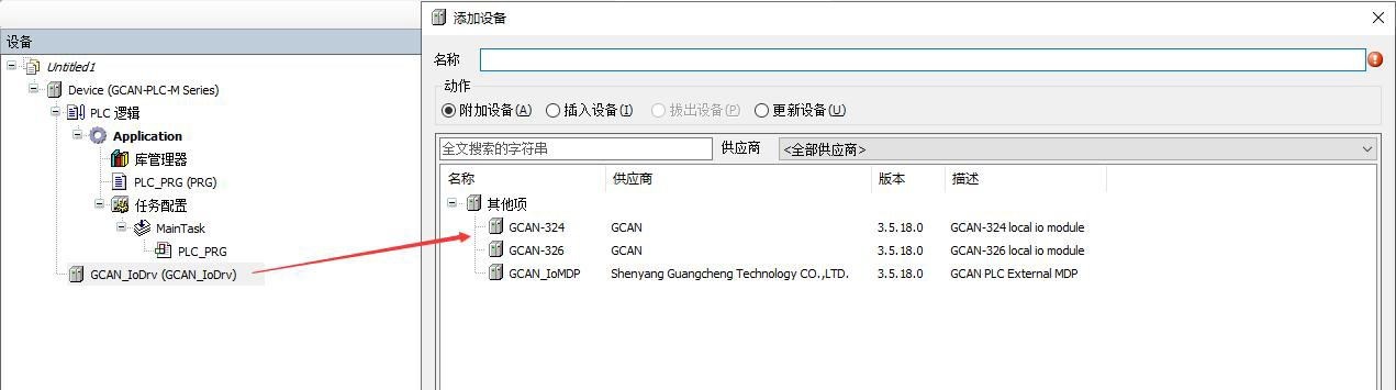 設(shè)備/POU窗口->Device右鍵->添加設(shè)備,選擇GCAN_IoDrv;GCAN_IoDrv右鍵->添加設(shè)備,選擇GCAN-324。