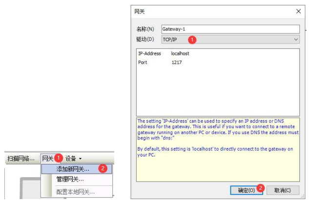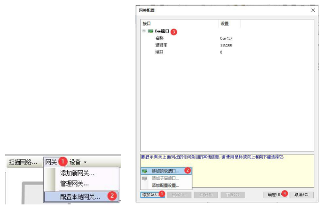 網(wǎng)關(guān)->添加新網(wǎng)關(guān),驅(qū)動選TCP/IP,點(diǎn)擊“確定”按鈕;網(wǎng)關(guān)->配置本地網(wǎng)關(guān),添加頂級接口,選擇Com端口,波特率選擇115200,點(diǎn)擊“確定”按鈕。
