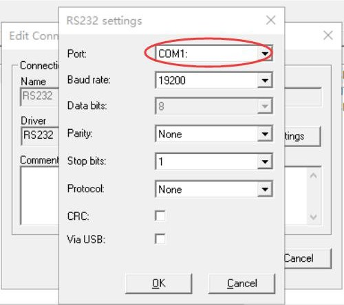 6、Port(端口)請選擇USB-Enhanced-SERIAL-A對應(yīng)的端口,支持小于等于COM9,波特率固定為19200,設(shè)置好后點(diǎn)OK。