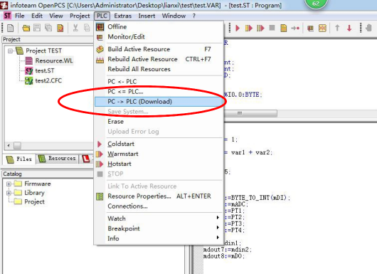 4、在下拉菜單中點(diǎn)擊PC->PLC(Download)下載程序。