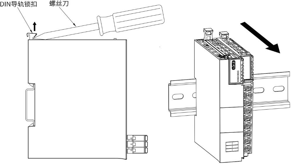 如圖所示,使用一字螺絲刀或類似工具向上撬動(dòng)導(dǎo)軌鎖扣,在凸起部位將模塊向外拉出,將模塊取出。
