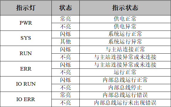 指示燈的具體指示功能見(jiàn)下表。指示燈處于不同狀態(tài)下時(shí),GCAN-IO-8201模塊狀態(tài)如下表所示。