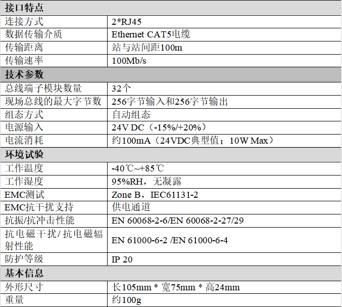 (1)2個(gè)EtherCAT總線接口,EtherCAT/IN和EtherCAT/OUT(RJ45);(2)總線傳輸速率:100Mbps;(3)總線傳輸距離(站與站間距):100m;(4)組態(tài)方式根據(jù)IO插片順序組態(tài);(5)電源采用24V DC(-15%/+20%);(6)電流消耗約100mA(24V DC典型值;為后續(xù)IO提供功耗10W Max);(7)電氣隔離為1500 Vrms;(8)工作溫度范圍:-40℃~+85℃;(9)尺寸:長(zhǎng)105mm*寬75mm*高24mm。