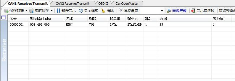 例如:通過(guò)撥碼開(kāi)關(guān)設(shè)置GCAN-4032的Node ID為1(以下節(jié)點(diǎn)號(hào)均為1),則USBCAN-II Pro作為主站設(shè)備可接收到一條節(jié)點(diǎn)狀態(tài)數(shù)據(jù),幀ID為0x701,幀數(shù)據(jù)為0x7F。如圖所示,使用GCANTools軟件可以收到這條數(shù)據(jù)。