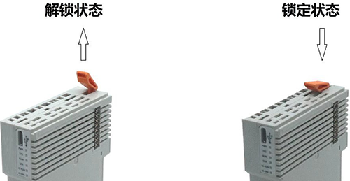 GCAN-PLC-425可編程邏輯控制器的鎖定和解鎖狀態(tài)如圖所示。當模塊未安裝在導軌上時,請將導軌鎖扣保持在鎖定狀態(tài),如長時間處于解鎖狀態(tài),可能會導致鎖扣失效。