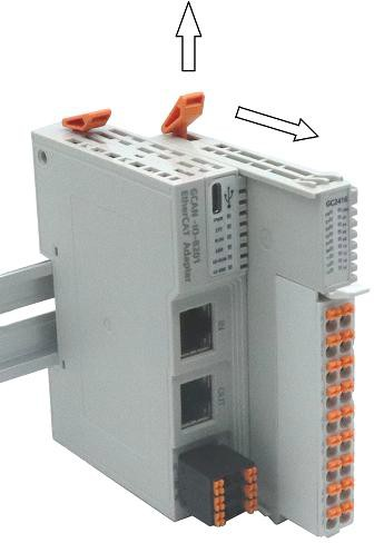 GCAN-PLC-425可編程邏輯控制器的安裝方法如下圖所示。首先把GCAN-PLC-425可編程邏輯控制器安裝在導軌上,再按下鎖扣并發(fā)出“咔”的一聲。