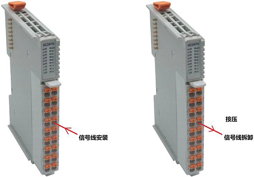 使用一字端子接頭的線纜,將端子接頭對準相應通道的圓孔插入即可;拆線時,需使用一字螺絲刀,插入需拆線的通道旁對應橘黃色方形孔,用力向下按壓,此時相應圓孔中的夾片會松動,線纜即可輕松拔出。