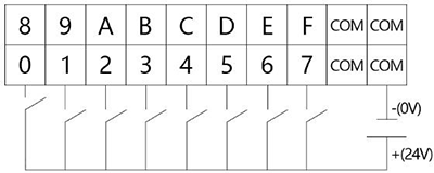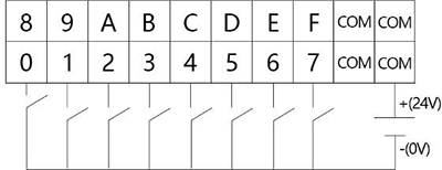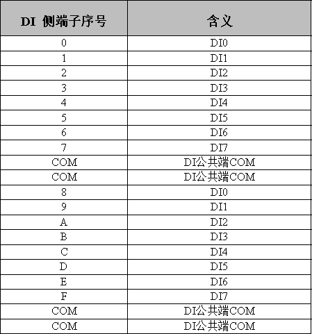 上方兩排端子為DI端子排,分別為DI0~DI7,DI8~DIF共16個(gè)數(shù)字量輸入點(diǎn),以及4個(gè)DI的COM接口(4個(gè)COM口內(nèi)部已短接,任意連接1個(gè)即可),如圖所示。各個(gè)端子對(duì)應(yīng)的序號(hào)及其含義如表所示。