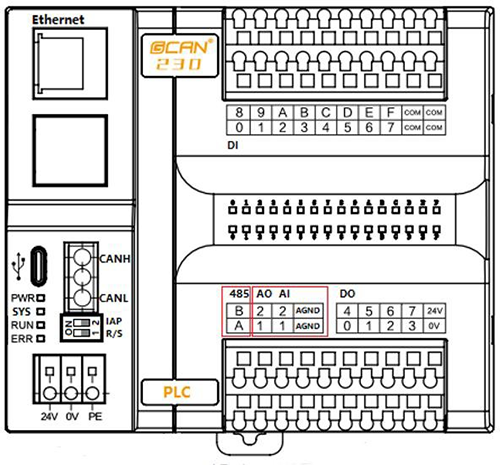 GCAN-PLC-230設(shè)備包含1個(gè)電源接口,一個(gè)USB-Type C接口,1路CAN通信接口,1路RS485通信接口,1路Ethernet通信接口,2路AI接口;2路AO接口;8路DO接口,16路DI接口。控制器編程接口使用Ethernet接口,接口定義如下表所示: