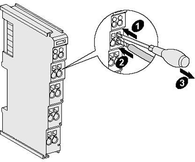 GCAN-PLC的電源模塊及GC系列IO模塊的接線方法如圖2.5所示,先使用一字螺絲刀插入方形孔中,頂住方形孔中金屬片的上沿,用力垂直向里壓。之后將線纜插入圓形孔中。插好之后,拔出螺絲刀,線纜即可穩(wěn)固地鎖死在圓形孔中。