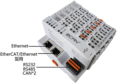 GCAN-PLC-521總線通信接口由2個RJ45接口與端子接口組成。RJ45接口包括1個以太網(wǎng)接口(出廠IP地址192.168.1.30)、1個EtherCAT/以太網(wǎng)(出廠IP地址192.168.2.30)復(fù)用接口: