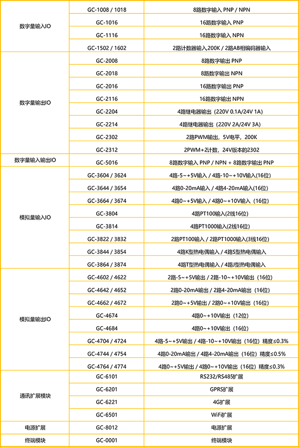GC系列IO模塊覆蓋全面,包括:開關(guān)量輸入及輸出模塊、模擬量輸入及輸出模塊、脈沖輸入及輸出模塊、通訊口擴展模塊(RS232/485、4G、WiFi、GPRS等)。