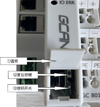 GCAN-PLC-522提供1個(gè)程序運(yùn)行開(kāi)關(guān)和1個(gè)復(fù)位按鈕。打開(kāi)蓋板后實(shí)物圖,如圖4.1所示。