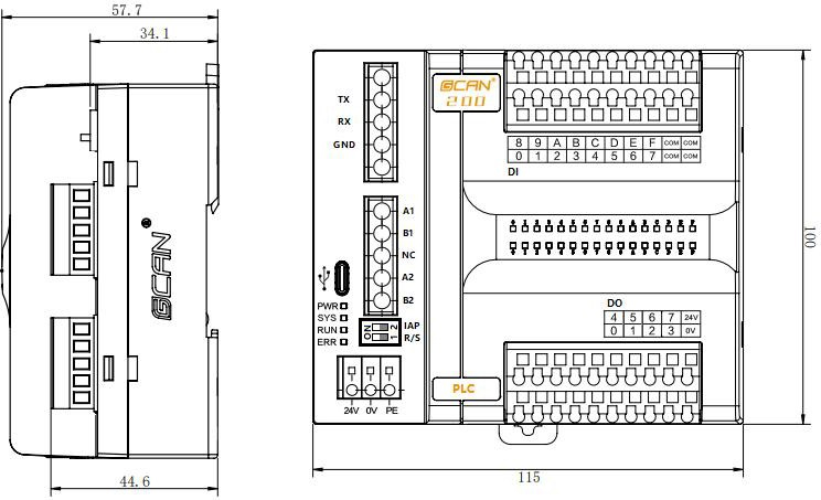 GCAN-PLC-200外觀如圖2.1所示,(長)115mm*(寬)100mm*(高)58mm。