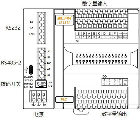 GCAN-PLC-200設(shè)備包含1個電源接口,一個USB-Type C接口,1路RS232通信接口,2路RS485通信接口;8路DO接口,16路DI接口。控制器編程接口使用USB接口,接口定義如下表所示。