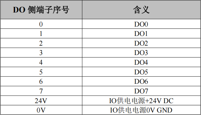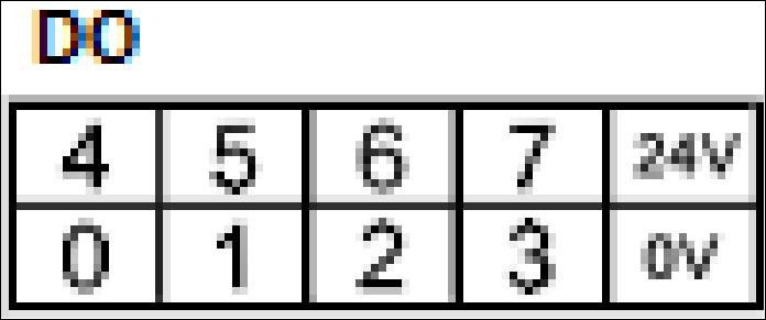 GCAN-PLC-200的主控模塊右側(cè)頂板含有上下四排端子排,下方兩排端子排的右側(cè)為DO端子排,分別為DO0~DO7共8個數(shù)字量輸出點(diǎn),以及1組IO供電電源接口(IO供電電源已與系統(tǒng)電源隔離,IO模塊需供電后才能正常工作),如圖所示。各個端子對應(yīng)的序號及其含義如表2.4所示。