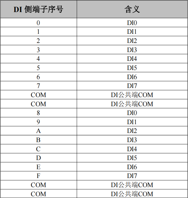 上方兩排端子為DI端子排,分別為DI0~DI7,DI8~DIF共16個數(shù)字量輸入點(diǎn),以及4個DI的COM接口(4個COM口內(nèi)部已短接,任意連接1個即可),如圖所示。各個端子對應(yīng)的序號及其含義如表2.5所示。