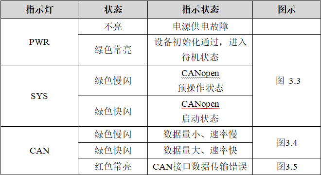 GCAN-4048模塊具有1個(gè)SYS指示燈、1個(gè)PWR指示燈、1個(gè)CAN指示燈來(lái)指示設(shè)備的運(yùn)行狀態(tài)。這3種指示燈的具體指示功能及狀態(tài)如表所示。
