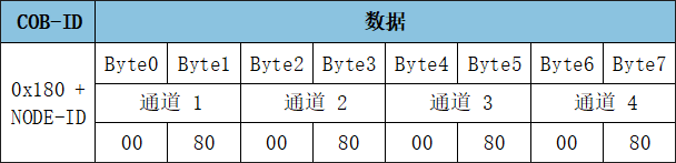 當(dāng)前狀態(tài),TPDO用于表示模擬量采集目前的狀態(tài),共有2個(gè)TPDO。其中TPDO1代表前4個(gè)通道,幀ID為0x180+Node ID。TPDO2代表后4個(gè)通道,幀ID為0x280+Node ID。