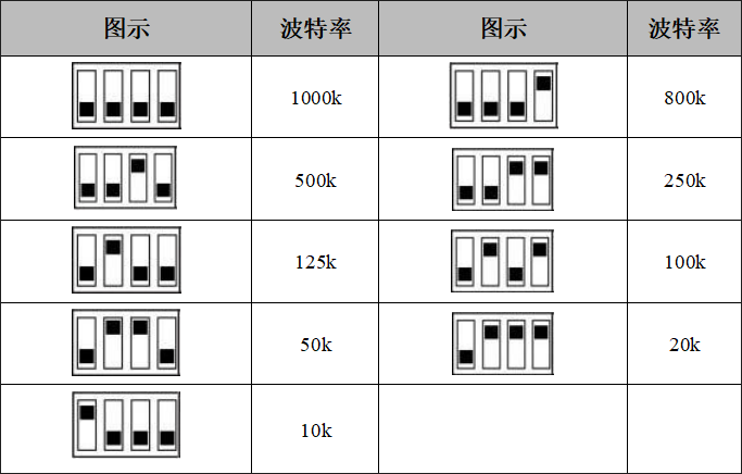 右側(cè)撥碼開關(guān)的1-4位用于設(shè)定模塊的波特率,第一位為低位,第四位為高位。波特率與開關(guān)設(shè)置對(duì)應(yīng)值如下表所示。