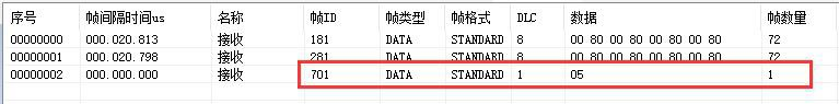 例如:默認(rèn)GCAN-4048的Node ID為1(以下節(jié)點(diǎn)號(hào)均為1),則主站設(shè)備可接收到一條節(jié)點(diǎn)狀態(tài)數(shù)據(jù),幀ID為0x701,標(biāo)準(zhǔn)幀,數(shù)據(jù)為0x05。