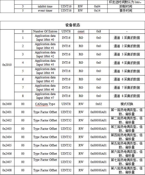 GCAN-4048模塊可通過(guò)發(fā)送SDO命令寫參數(shù),修改模塊每一路輸入的熱電偶類型、倍數(shù)、偏移量。該參數(shù)位于對(duì)象字典索引0x2401至2408、子索引0x00,數(shù)據(jù)類型Unsigned32。每一路的熱電偶類型、倍數(shù)、偏移量均可自由配置為不同類型。倍數(shù)的數(shù)據(jù)類型為Unsigned8,為了確定精度,必須大于0。偏移量的數(shù)據(jù)類型為INTEGER16,正負(fù)值均可。