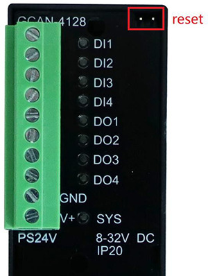 GCAN-4128模塊集成4路數(shù)字量輸入接口、4路數(shù)字量輸出接口、1路DC8~32V電源接口、1路CAN總線,2個(gè)CAN接口、1路系統(tǒng)復(fù)位接口。GCAN-4128模塊數(shù)字量接口、電源接口、系統(tǒng)復(fù)位接口位置如圖所示,接口定義如表所示。