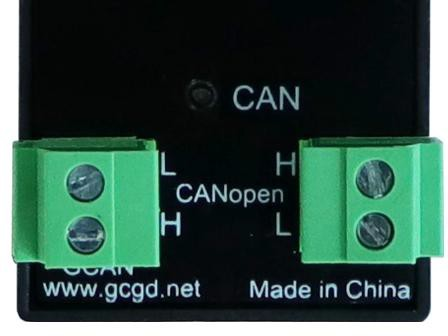 GCAN-4128模塊的CAN-bus通道,由1路2 Pin插拔式接線端子引出,左右2個(gè)CAN接口,可以用于連接1個(gè)CAN-bus網(wǎng)絡(luò)或者CAN-bus接口的設(shè)備,支持CANopen協(xié)議。GCAN-4128模塊CAN-bus接口接口位置如圖所示,接口定義如表所示。