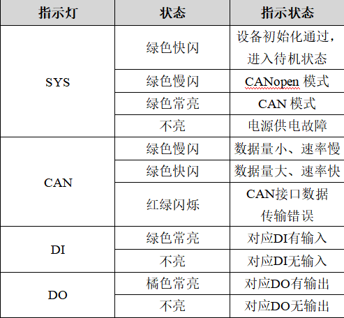 GCAN-4128模塊具有1個(gè)SYS指示燈、8個(gè)IO指示燈、1個(gè)CAN指示燈來指示設(shè)備的運(yùn)行狀態(tài)。這3種指示燈的具體指示功能及狀態(tài)如表所示。