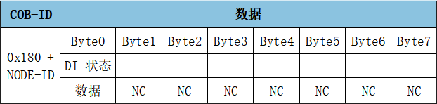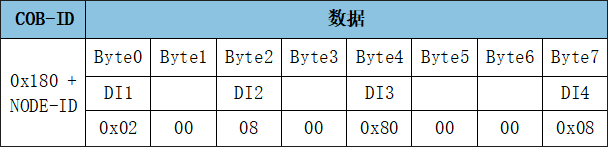 GCAN-4128模塊采用PDO(Process Data Object,過程數(shù)據(jù)對(duì)象)對(duì)數(shù)字量信號(hào)進(jìn)行采集或?qū)懭胼敵?。DI、DO每一路的具體位置均可自由配置。其中,TPDO1用于表示數(shù)字量DI狀態(tài),幀ID為0x180+Node ID,默認(rèn)幀數(shù)據(jù)第一個(gè)字節(jié)為數(shù)字量輸入狀態(tài)。