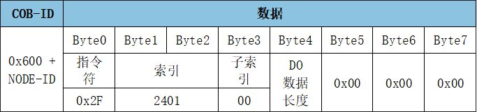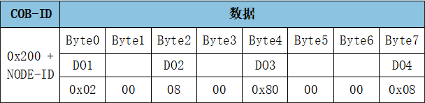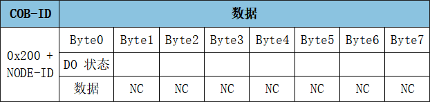 RPDO1用于表示改變(寫入)數(shù)字量輸出的狀態(tài),幀ID為0x200+Node ID,數(shù)字量輸出默認(rèn)由一個(gè)字節(jié)來控制(寫入),DO4在高位,DO1在低位。
