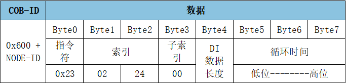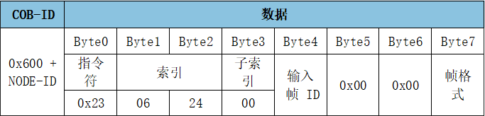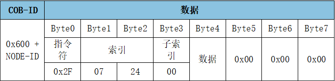 報(bào)文:ID:0x601數(shù)據(jù):2F 07 24 00 03 00 00 00,設(shè)置模塊節(jié)點(diǎn)號(hào)Node ID為3。