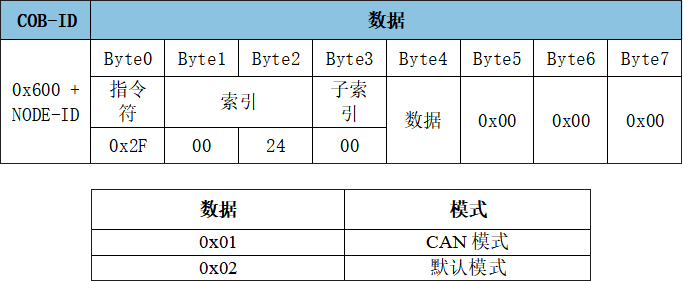報(bào)文:ID:0x601數(shù)據(jù):2F 00 24 00 03 00 00 00,設(shè)置模塊為CAN模式。