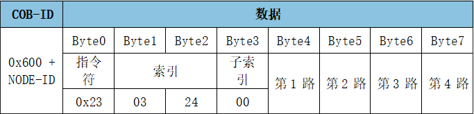 報(bào)文:ID:0x601數(shù)據(jù):23 03 24 00 02 14 28 3C,設(shè)置模塊第4路在0x3C即十進(jìn)制第60位可被寫入,模塊第3路在0x28即十進(jìn)制第40位可被寫入,模塊第2路在0x14即十進(jìn)制第20位可被寫入,模塊第4路在0x02即十進(jìn)制第2位可被寫入。