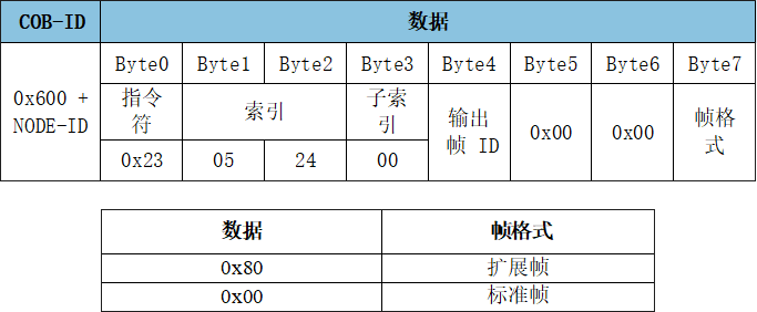 報(bào)文:ID:0x601數(shù)據(jù):23 05 24 00 33 00 00 00,設(shè)置模塊輸出數(shù)據(jù)幀ID為0x33,幀格式為標(biāo)準(zhǔn)幀。
