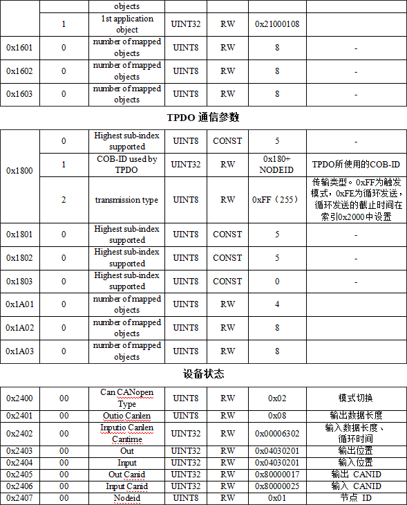 當(dāng)前狀態(tài),TPDO1用于表示數(shù)字量DI狀態(tài),如圖所示,幀ID為0x180+NodeID,默認(rèn)幀數(shù)據(jù)第一個(gè)字節(jié)為數(shù)字量輸入狀態(tài)。DI4在高位,DI1在低位。RPDO1用于表示控制(寫入)數(shù)字量輸出的狀態(tài),幀ID為0x200+Node ID,數(shù)字量輸出默認(rèn)由一個(gè)字節(jié)來控制(寫入),DO4在高位,DO1在低位。