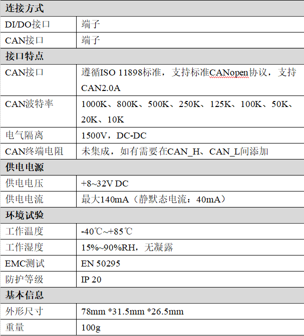 (1)CAN-bus支持CAN2.0A幀格式,符合ISO/DIS 11898規(guī)范;(2)CAN-bus通訊波特率在10Kbps~1Mbps之間任意可編程;(3)CAN-bus接口采用電氣隔離,隔離模塊絕緣電壓:DC 1500V;(4)使用8~32V DC供電(推薦標(biāo)準(zhǔn)電壓24V);(5)數(shù)字量輸入通道數(shù):4路;(6)數(shù)字量輸出通道數(shù):4路;(7)數(shù)字量輸入高電平信號(hào)(數(shù)字1):5V~32V;(8)數(shù)字量輸入低電平信號(hào)(數(shù)字0):0~2V;(9)數(shù)字量輸出信號(hào):有輸出時(shí),供電電壓-0.5V,額定輸出電流100mA;(10)數(shù)字量輸出信號(hào):無輸出時(shí),0~0.5V,不輸出電流;(11)工作溫度范圍:-40℃~+85℃;(12)工作濕度:≤95%RH,無凝露;(13)防護(hù)等級(jí):IP20;(14)EMC測(cè)試:EN50295。