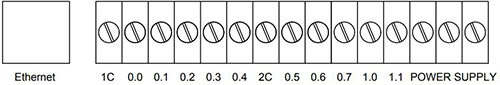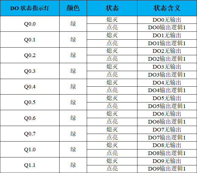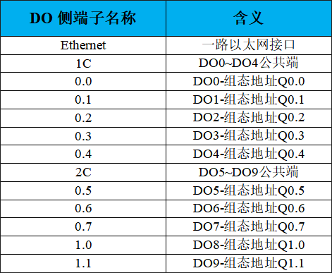 GCAN-PLC-324E/R系列的主控模塊含有上下兩排端子排,上方端子排包含一個RJ45接口和DO端子排,DO端子排分別為Q0.0~Q0.7,Q1.0~Q1.1共10個數(shù)字量輸出點,其中DO0、DO1為PNP數(shù)字量輸出及PWM高速脈沖輸出復用接口,以及供電接口,如圖所示。