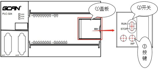 GCAN-PLC-324E/R提供1個程序運行開關和1個復位按鈕。打開圖示蓋板后開關及按鍵位置如圖所示。