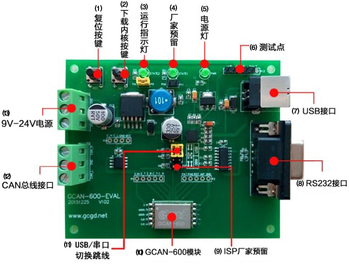 GCAN-600-EVAL開發(fā)調試板。如下圖所示: